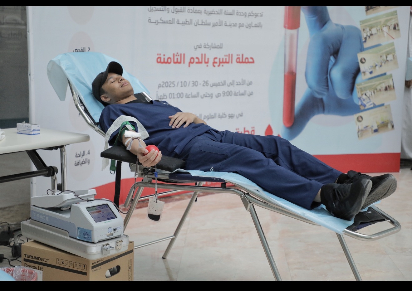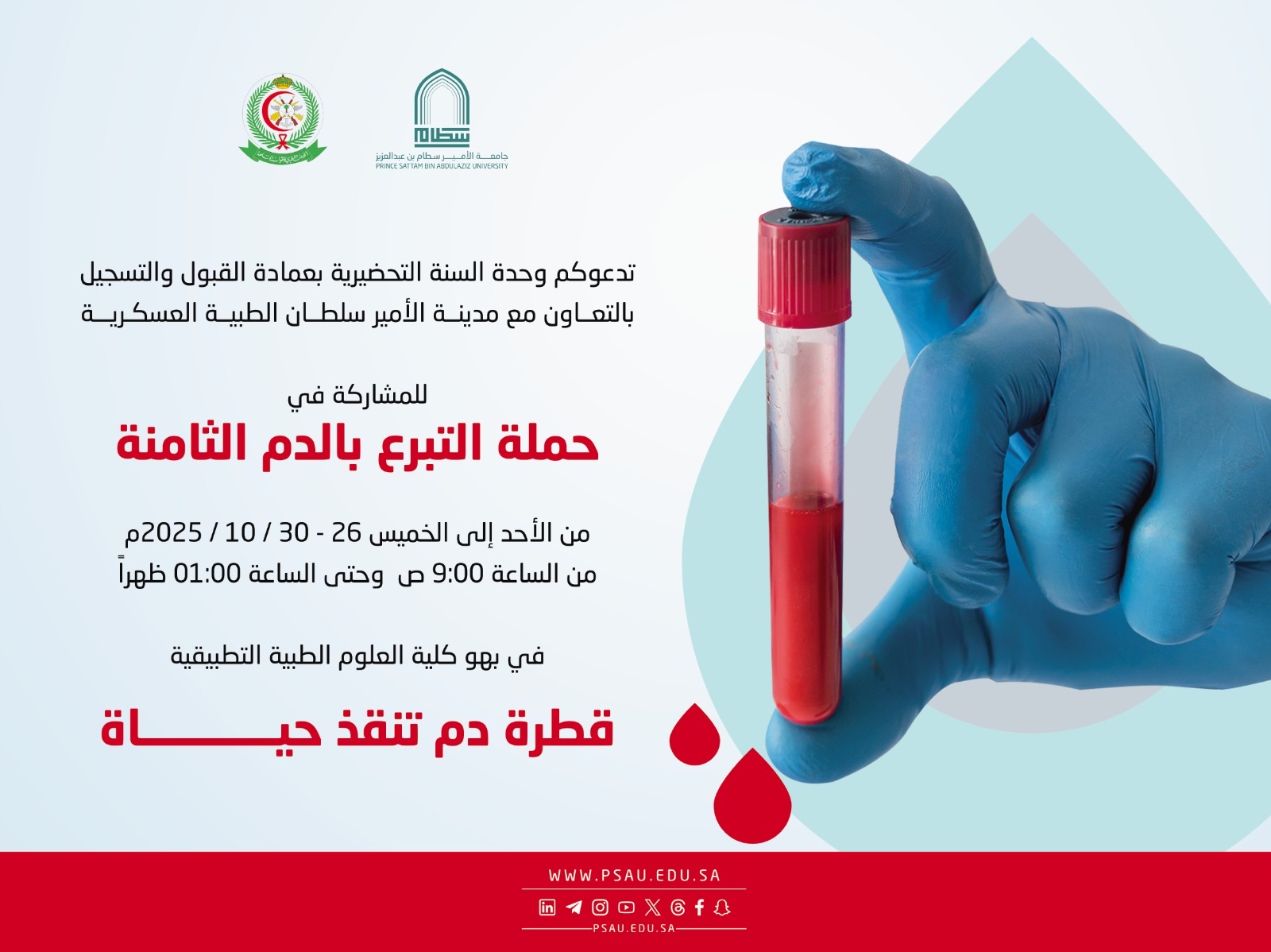في إطار مسؤوليتها الاجتماعية وحرصها على تعزيز روح التطوع والعطاء، نظّمت عمادة القبول والتسجيل ممثلةً بـ وحدة السنة التحضيرية، وبالتعاون مع مدينة الأمير سلطان الطبية العسكرية، حملة التبرع بالدم الثامنة تحت شعار “قطرة دم تنقذ حياة”، وذلك في مقر السنه التحضيرية لمدة اسبوع من تاريخ ٢٦-١٠-٢٠٢٥م.