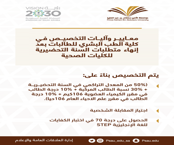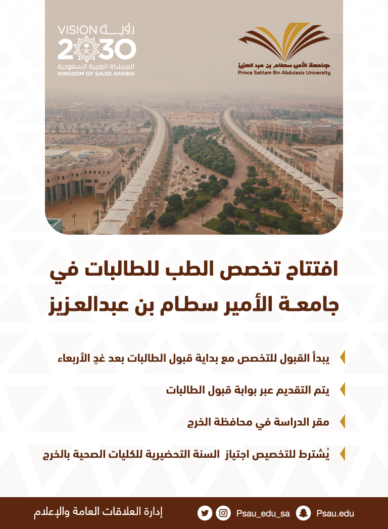 أعلنت عمادة القبول والتسجيل بجامعة الأمير سطام عن فتح القبول في تخصص الطب البشري للطالبات في كلية الطب بالخرج خلال العام الدراسي 1443 هـ غداً الأربعاء عبر بوابة القبول للطالبات.