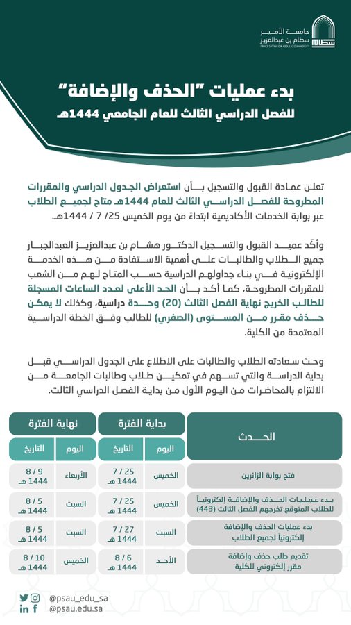 تعلن عمادة القبول والتسجيل بأن استعراض الجدول الدراسي والمقررات المطروحة للفصل الدراسي الثالث للعام الجامعي 1444هـ متاح لجميع الطلاب عبر بوابة الخدمات الأكاديمية ابتداءّ من يوم الخميس 25/07/1444هـ