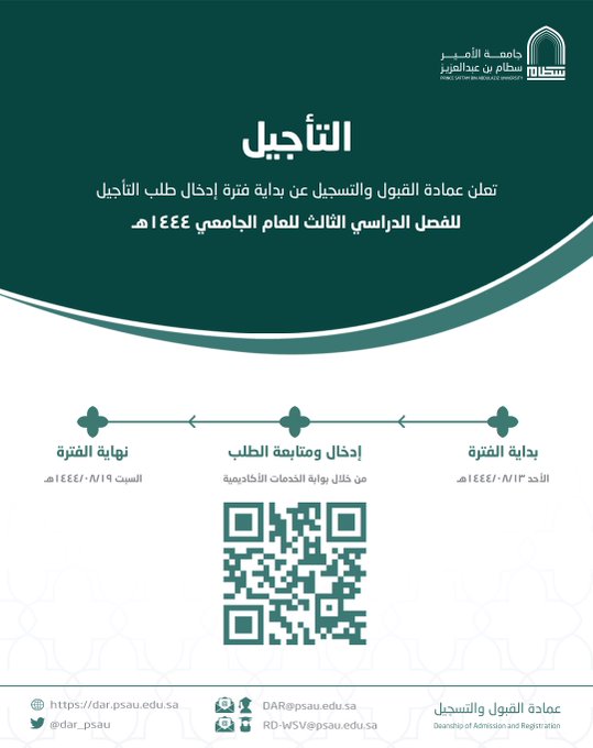 تعلن عمادة القبول والتسجيل عن بداية فترة إدخال طلب التأجيل (لفصل دراسي) للفصل الدراسي الثالث للعام الجامعي 1444هـ، ابتداءً من يوم الأحد القادم 13/08/1444هـ، وحتى يوم السبت 19-08-1444هـ، عبر البوابة الأكاديمية للطالب وذلك من خلال الرابط التالي: https://eserve.psau.edu.sa