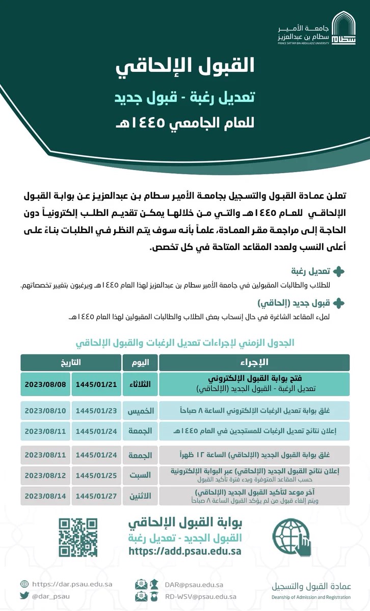 تعلن عمادة القبول والتسجيل بجامعة الأمير سطام عن بوابة القبول الإلحاقي (تعديل رغبة – قبول جديد) للعام 1445هـ والتي من خلالها يمكن تقديم الطلب إلكترونياً دون الحاجة إلى مراجعة مقر العمادة، علماً بأنه سوف يتم النظر في الطلبات بناءً على أعلى النسب ولعدد المقاعد المتاحة في كل تخصص.
