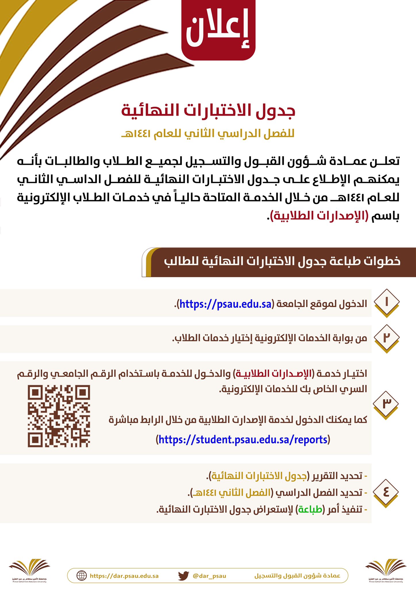 تعلن عمادة شؤون القبول والتسجيل لجميع الطلاب والطالبات بأنه يمكنهم الإطلاع على جدول الاختبارات النهائية للفصل الدراسي الثاني للعام 1441هـ من خلال الخدمة المتاحة حالياً في خدمات الطلاب الإلكترونية باسم(الإصدارات الطلابية)عبر الرابط التالي: https://student.psau.edu.sa/reports/Account/Loginلمزيد من المعلومات يرجى الإطلاع على البروشور التالي: