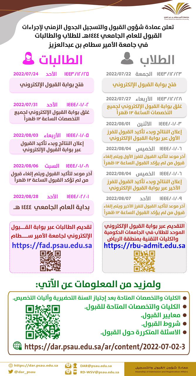 تعلن عمادة شؤون القبول والتسجيل عن مواعيد القبول بجامعة الأمير سطام بن عبدالعزيز للطلاب والطالبات الراغبين في الالتحاق بالجامعة لدرجة البكالوريوس ودرجة الدبلوم المتوسط الانتظام، بأن اللجنة الإشرافية للقبول الإلكتروني الموحد للطلاب في الجامعات الحكومية والكليات التقنية بمنطقة الرياض أقرت يوم الجمعة الموافق 23/ 12 / 1443هـ (حسب تقويم أم القرى) موعداً لبدء التقديم على بوابة القبول الإلكتروني الموحد للطلاب بمنطقة الرياض ، كما أقرت أن يكون موعد الانتهاء من التقديم على البوابة في جميع التخصصات في تمام الساعة الثانية عشرة ظهراً من يوم الأربعاء الموافق 28 / 12 / 1443هـ، وذلك عبر بوابة القبول الإلكتروني الموحد للطلاب من خلال الرابط التالي: