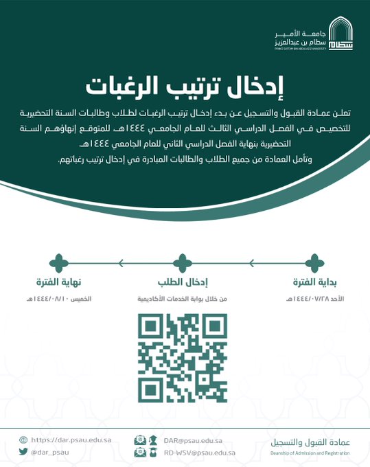 تعلن عمادة القبول والتسجيل عن بدء إدخال ترتيب الرغبات لطلاب وطالبات السنة التحضيرية للتخصيص في الفصل الدراسي الثالث للعام الجامعي 1444هـ، للمتوقع إنهاؤهم السنة التحضيرية بنهاية الفصل الدراسي الثاني للعام الجامعي 1444هـ، ابتداءً من يوم الأحد القادم 28/07/1444هـ وذلك من خلال بوابة الخدمات الأكاديمية للطالب حتى يوم الخميس 10-08-1444هـ