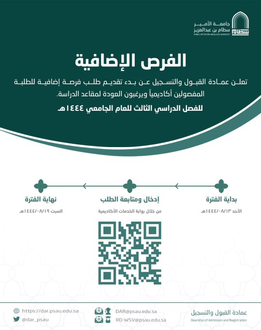 تعلن وكالة الجامعة للشؤون التعليمية والأكاديمية ممثلة في عمادة القبول والتسجيل عن بدء تقديم طلب فرصة إضافية للطلبة المفصولين أكاديمياً ويرغبون العودة لمقاعد الدراسة للفصل الدراسي الثالث للعام الجامعي 1444هـ، ابتداءً من يوم الأحد القادم 13-08-1444هـ وحتى يوم السبت 19-08-1444هـ