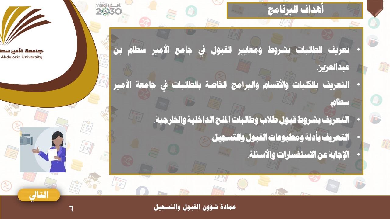 حيث قدمت سعادة وكيلة عمادة شؤون القبول والتسجيل الدكتورة جنان بنت عبد العزيز التميمي في مقر ثانوية مدارس الجامعة الأهلية (البرنامج) من خلال الشرح للطالبات ومساعدتهم على التعرف بآلية القبول في الجامعة وتوضيح شروط ومعايير القبول، إضافةَ إلى استعراض الكليات والأقسام والبرامج الخاصة بالطالبات في الجامعة، والتعريف بشروط قبول الطلاب وطالبات المنح الداخلية والخارجية، وفي ختام اللقاء قدمت الدكتورة جنان التميمي الإجابة عن الأسئلة والاستفسارات الهامة للطالبات المتعلقة بمحتويات البرنامج.