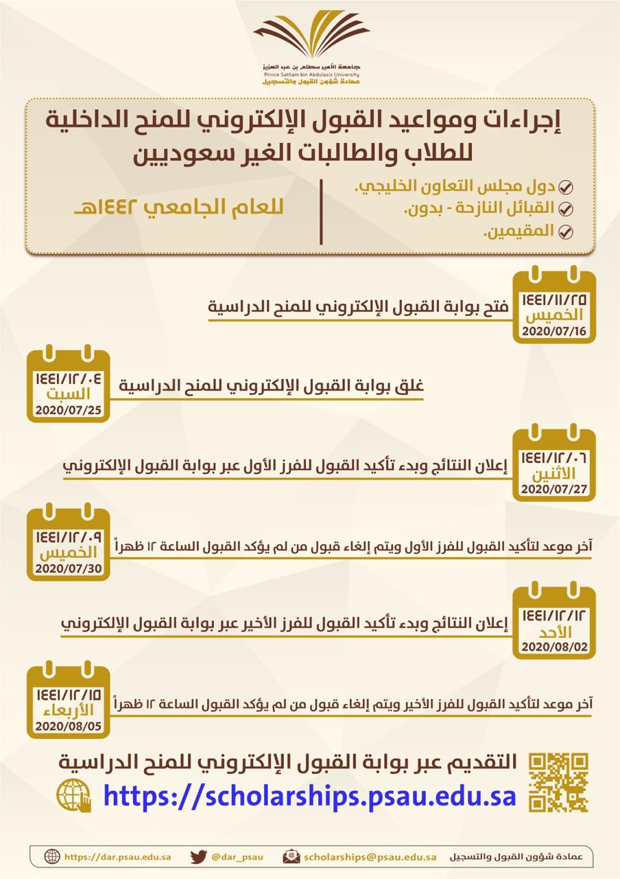 فتح باب القبول للطلاب والطالبات غير السعوديين للعام الجامعي 1442هـتعلن عمادة شؤون القبول والتسجيل بجامعة الأمير سطام بن عبدالعزيز عن بدء استقبال طلبات القبول لبرنامج المنح الداخلية لمرحلة البكالوريوس للعام الجامعي 1442هـ للطلاب والطالبات غير السعوديين (دول مجلس التعاون الخليجي- القبائل النازحة بدون - المقيمين) الحاصلين على الثانوية العامة من المملكة العربية السعودية ابتداء من يوم الخميس 25/11/1441هـ الموافق 16/07/2020م وحتى يوم السبت 04/12/1441هـ الموافق 25/07/2020م. الساعة 12 ظهرا. وأوضح سعادة عميد شؤون القبول والتسجيل الدكتور عبدالعزيز بن محمد الصقر بأن تقديم طلب القبول للمنح الداخلية يكون عبر بوابة القبول الإلكتروني للجامعة من خلال الرابط التالي:https://scholarships.psau.edu.saكما أكد سعادة عميد شؤون القبول والتسجيل بضرورة رفع المستندات المطلوبة من خلال بوابة القبول (شهادة الثانوية وصورة من الإقامة للمقيمين وصورة من جواز السفر لدول مجلس التعاون الخليجي سارية المفعول) بملف بصيغة (PDF) بصورة واضحة. لمزيد من المعلومات حول إجراءات ومواعيد القبول الإلكتروني للمنح الداخلية للطلاب والطالبات الغير سعوديين للعام الجامعي 1442هـ، الرجاء (اضغط هنا)