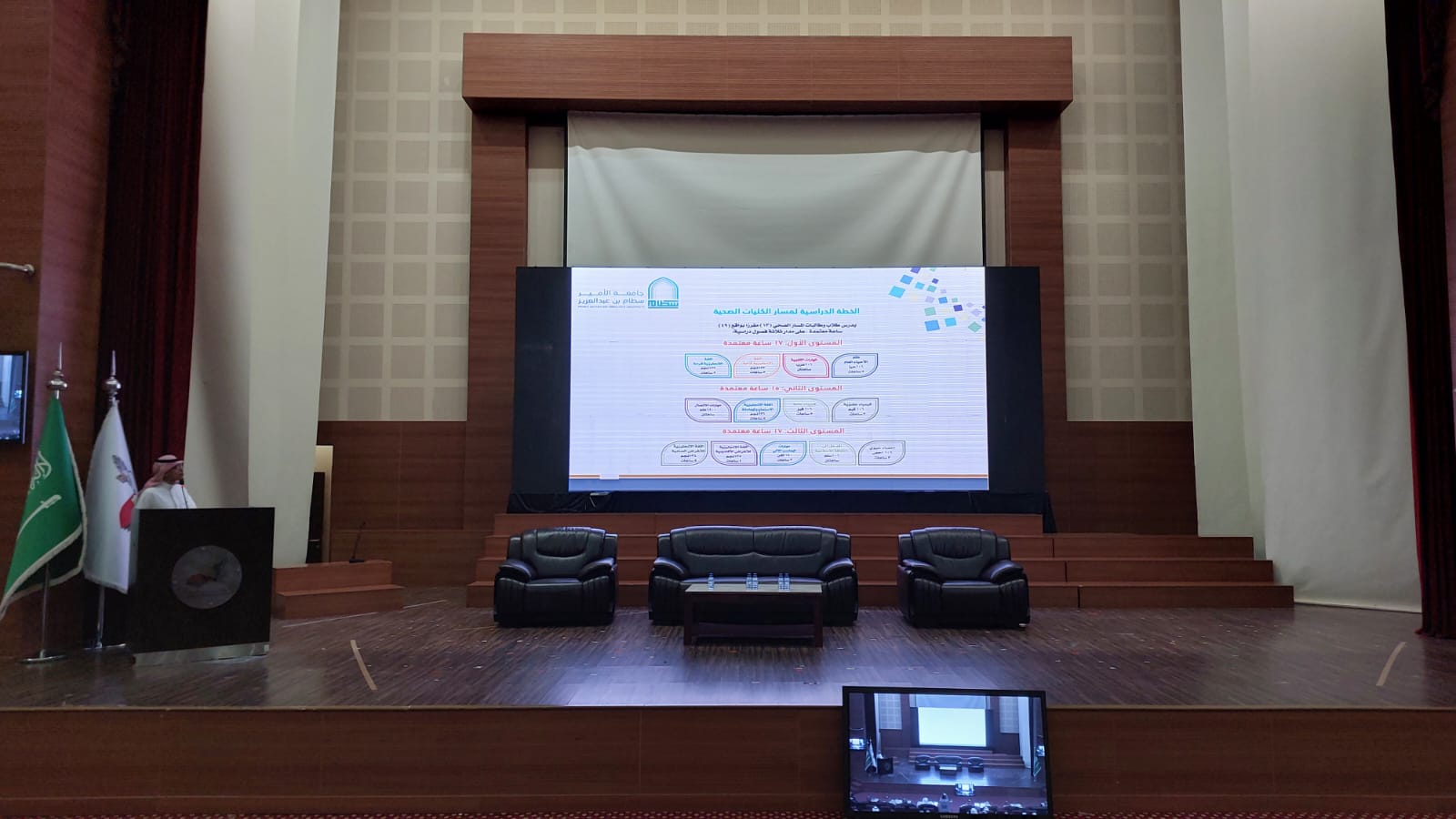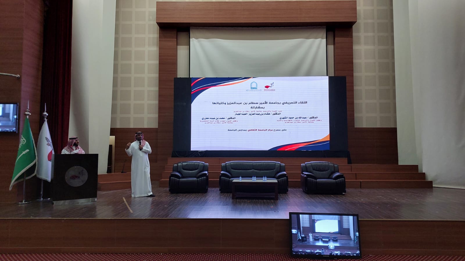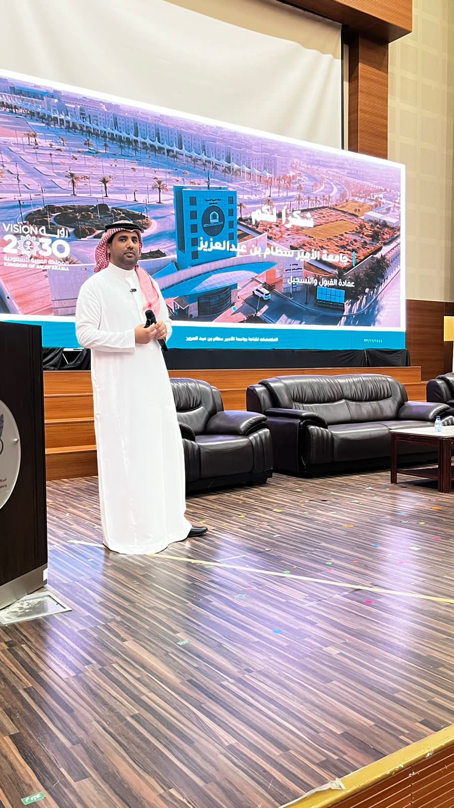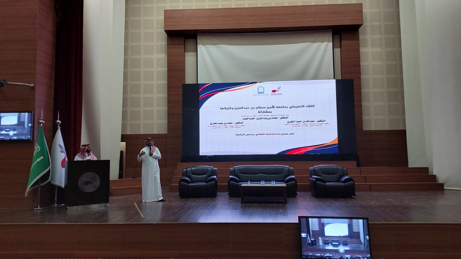 وفي بداية اللقاء توجه الحضور لقاعة مسرح مدارس الجامعة، حيث قدم سعادة وكيل العمادة الدكتور عبدالله الشهري عرضاً عن جامعة الأمير سطام بن عبدالعزيز وما تحتويه من كليات وتخصصات من جهة وشروط ومعايير القبول والتحويل من جهة أخرى، إضافةً إلى شرح مفصل عن آلية التقديم عبر بوابة القبول الإلكتروني الموحد للطلاب والطالبات، فيما استعرض سعادة وكيل العمادة لشؤون طلاب السنة التحضيرية الدكتور محمد محزري عرضاً عن برنامج السنة التحضيرية من خلال استعراض الخطط الدراسية للأقسام الدراسية للسنة التحضيرية، فضلاً عن شروط تغيير المسار لطلاب السنة التحضيرية و شروط التحويل من كليات الجامعة لبرنامج السنة التحضيرية